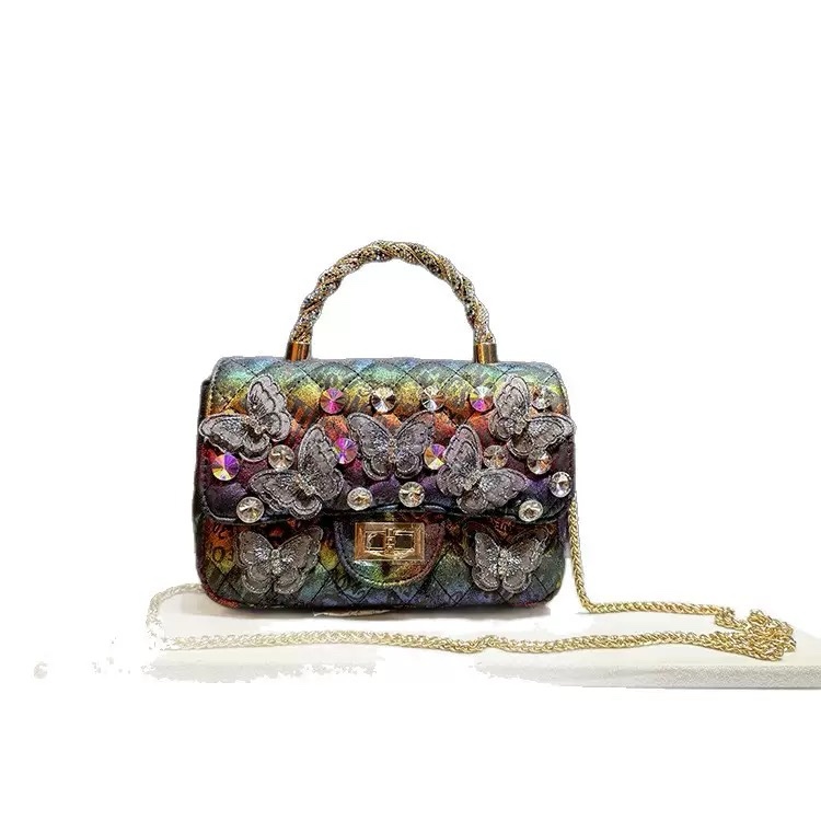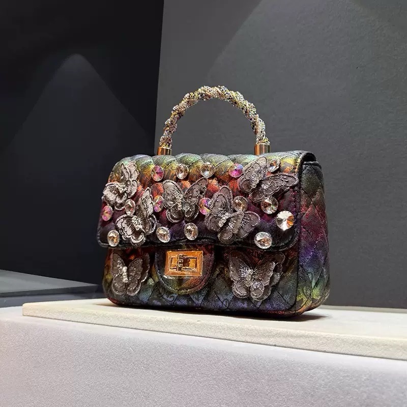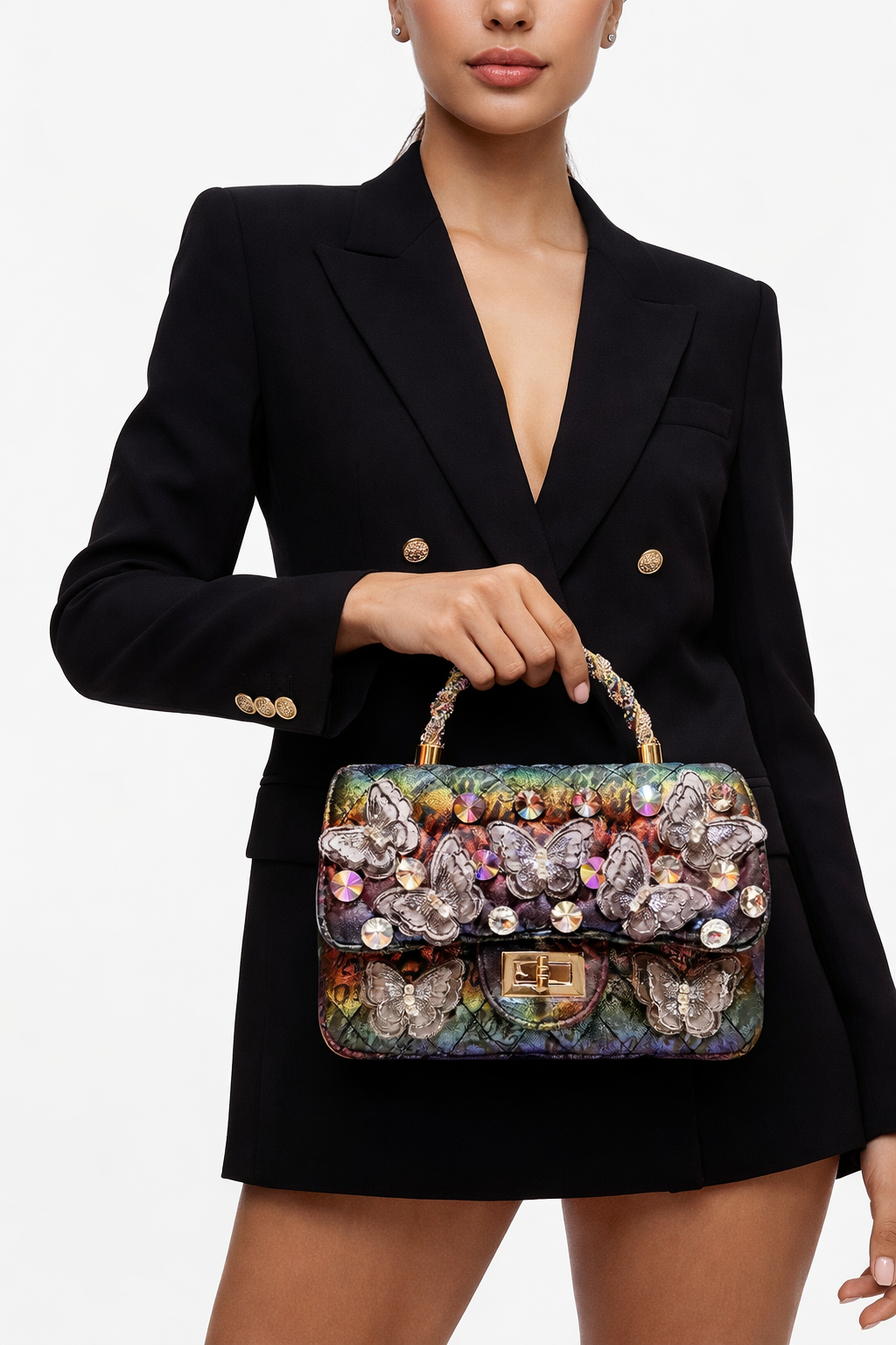 A stunning statement mini bag featuring sparkling crystals and elegant butterfly details. Perfect for adding a touch of luxury to any outfit, whether for a night out or special occasion. Comes with a stylish chain strap for easy wear. ✨