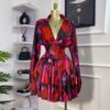 A sleek black long-sleeve mini dress featuring a shimmering ruched sequin skirt with a dramatic front drape—perfect for classy nights out and special occasions.